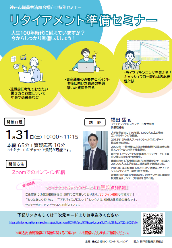 今年度は、退職前に考えておきたい働き方や資産形成、ライフプランニングをテーマとした「リタイアメント準備セミナー」をオンラインにより開催いたします。
